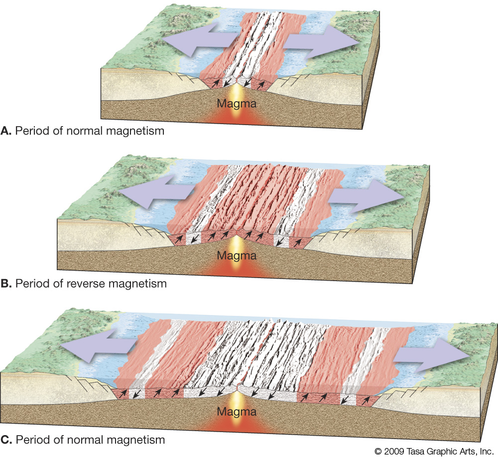 Reversals of the earth s magnetic field allied to sea floor spreading have left their imprint in the form of a magnetic tape recorder on the sea floor.