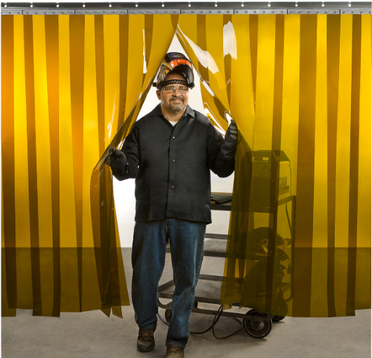 Amber or red tinted strip doors help protect against uv light emitted during welding.